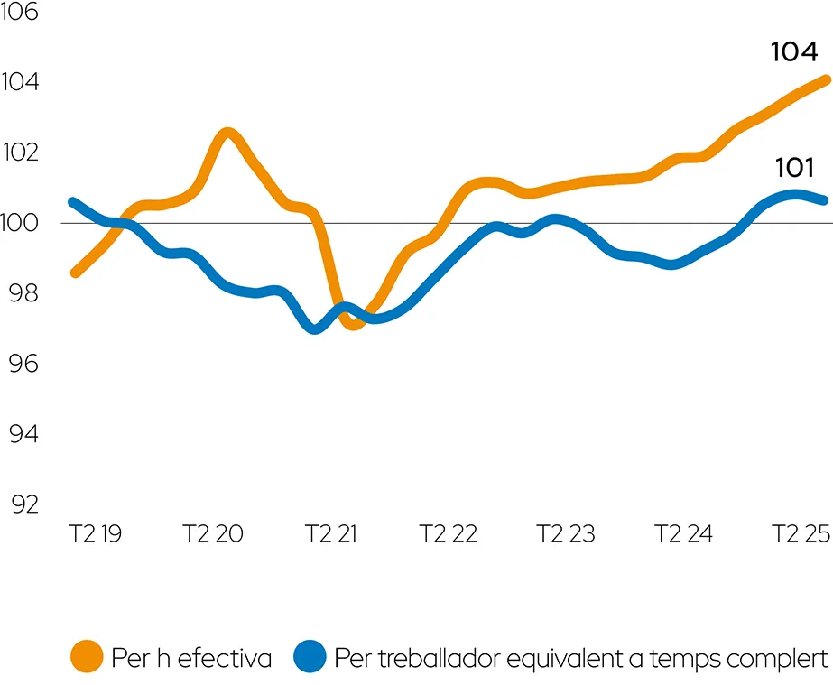 La productivitat per hora efectiva augmenta a una velocitat superior a la productivitat per treballador equivalent a temps complert, degut a l’augment d’hores no treballades per incapacitat temporal.
