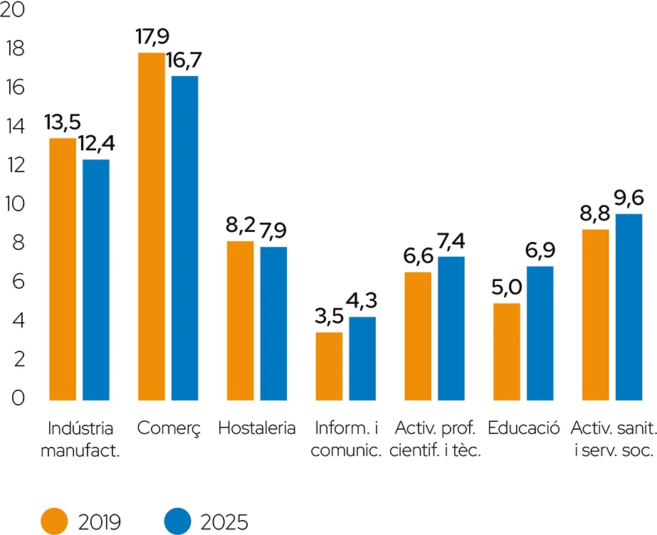 Informació i comunicacions, activitats professionals, educació i sanitat guanyen pes en el cicle expansiu 2019-2025, en termes d’ocupació.